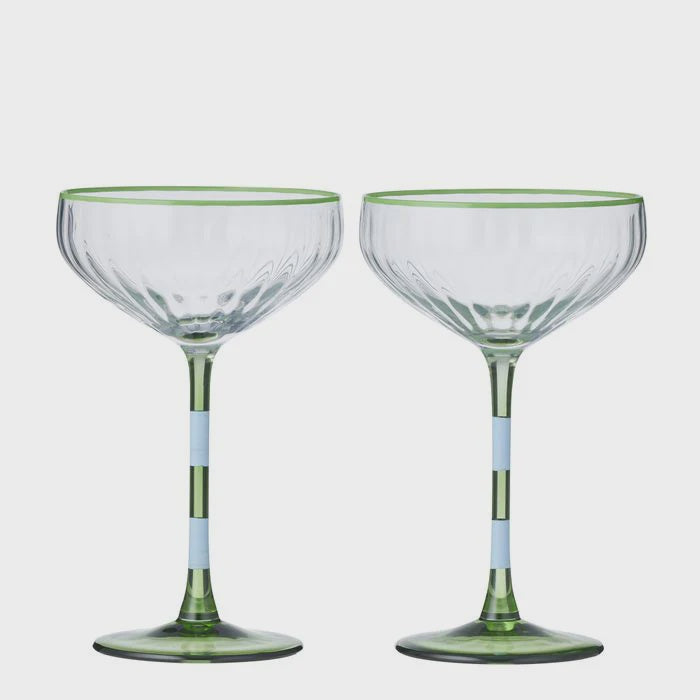 Elevate your entertaining with this set of 2 ribbed glass coupes in a stunning blue-green colourway. Their textured design adds a touch of sophistication, while the vibrant hues bring a refreshing pop of color to any occasion. Perfect for serving cocktails or sparkling beverages, these glasses combine style and function effortlessly.