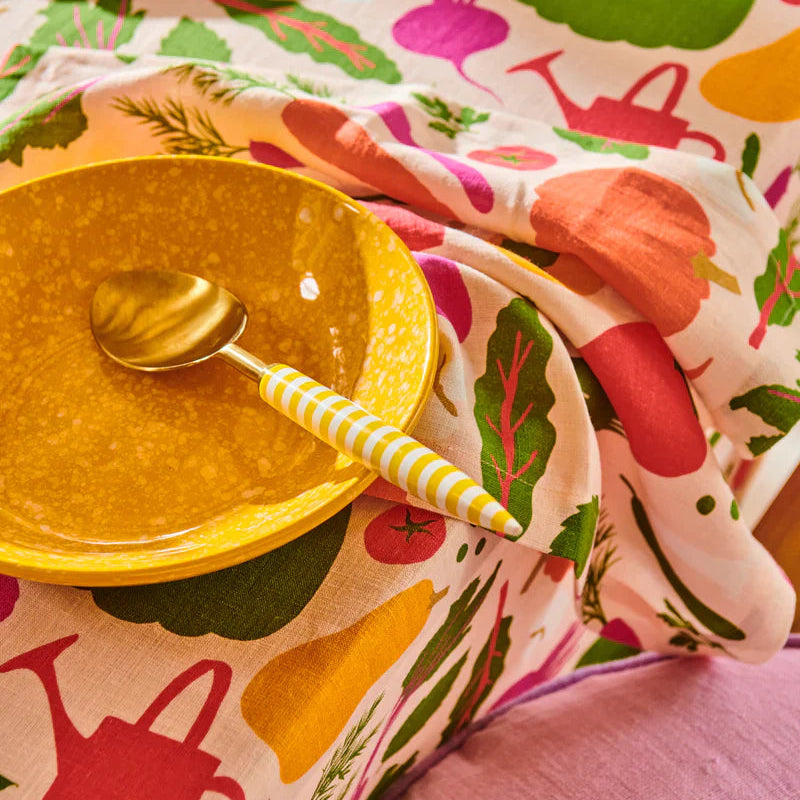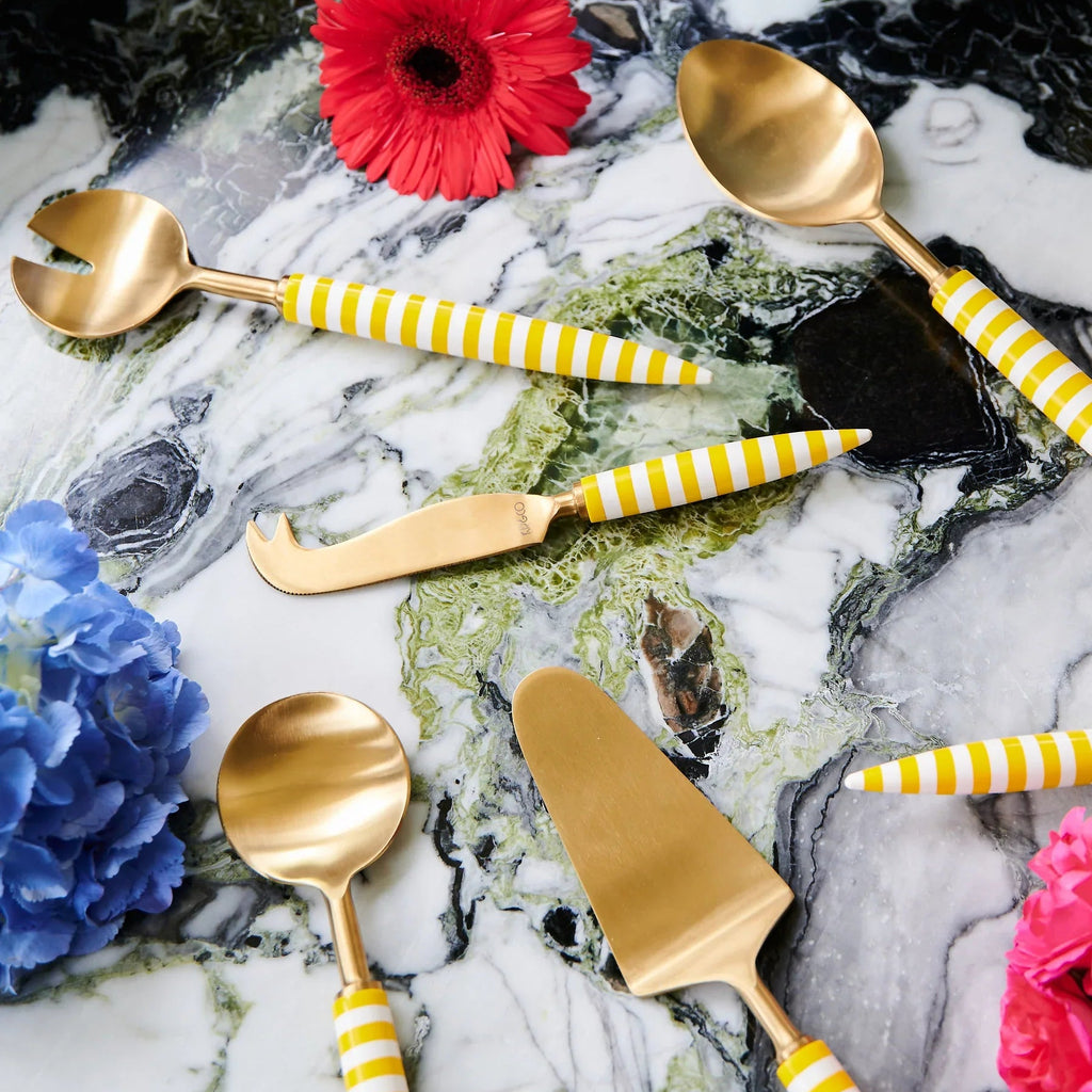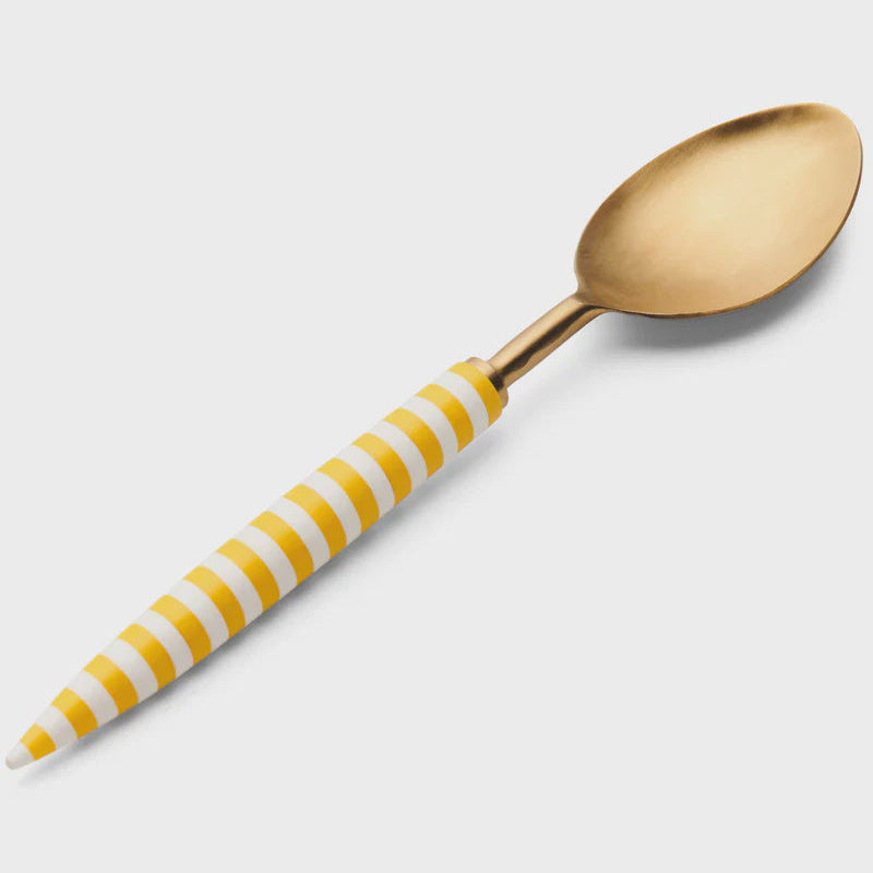 Dig deep into your favourite dish and serve up in style with the Solè Brasserie Serving Spoon. Made from brass coated stainless steel with hand crafted resin handle in a sunshine yellow and white stripe, this bold cutlery piece makes a colour boasting statement to your serveware game.